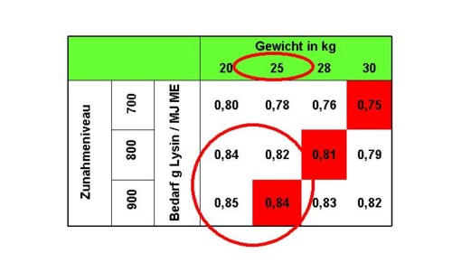Die Aminosäurenversorgung nimmt in der Ferkelaufzucht und Mast über den Fleischansatz deutlich Einfluss auf die tägliche Zunahme und letztendlich auf den "Magerfleischanteil". Hier geht kein Weg an einer entsprechenden Phasenfütterung vorbei. Die Empfehlungen der Wissenschaft zur Versorgung mit Aminosäuren sind vom DLG-Arbeitskreis "Futter und Fütterung" im Jahre 2002 neu zusammengestellt und publiziert worden. Die nachfolgende Tabelle gibt einen Überblick zu den Bedarfszahlen bei Mastbeginn.